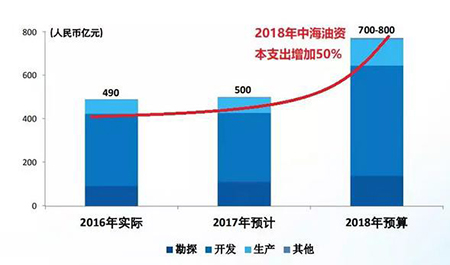 近日,中海油发布 2018年投资预算,总额为 700-800亿元,较2017年500 亿元增加近 50%!这也是继中海油投资在 2016 年降至历年低谷的 490 亿后,又逐渐恢复到800-900 之间的投资水平。(2013 年 900 亿,2014 年 1000 亿,2015 年 670 亿,2016 年 490 亿……)