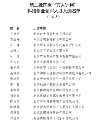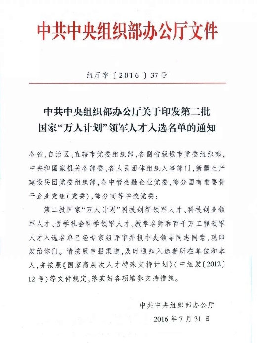 2016年8月1日,中共中央组织部办公厅印发《关于第二批国家“万人计划”领军人才入选名单的通知》(组厅字〔2016〕37号),全国共有620名科技创新领军人才和336名科技创业领军人才入选。我公司石岩峰董事长光荣入选国家“万人计划”科技创业领军人才。