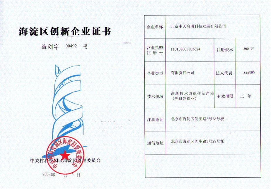 中天启明公司经过数年发展,在坚持不断自主创新的同时,得到了中关村科技园区管理委员会的肯定。2009年5月,公司被评为“海淀区创新企业”和“中关村高新技术企业”,同时被中关村科技项目担保有限公司评为“信用良好A级企业”,授予“信用担保信用证书”。