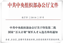 2016年8月1日,中共中央组织部办公厅印发《关于第二批国家“万人计划”领军人才入选名单的通知》(组厅字〔2016〕37号),全国共有620名科技创新领军人才和336名科技创业领军人才入选。我公司石岩峰董事长光荣入选国家“万人计划”科技创业领军人才。